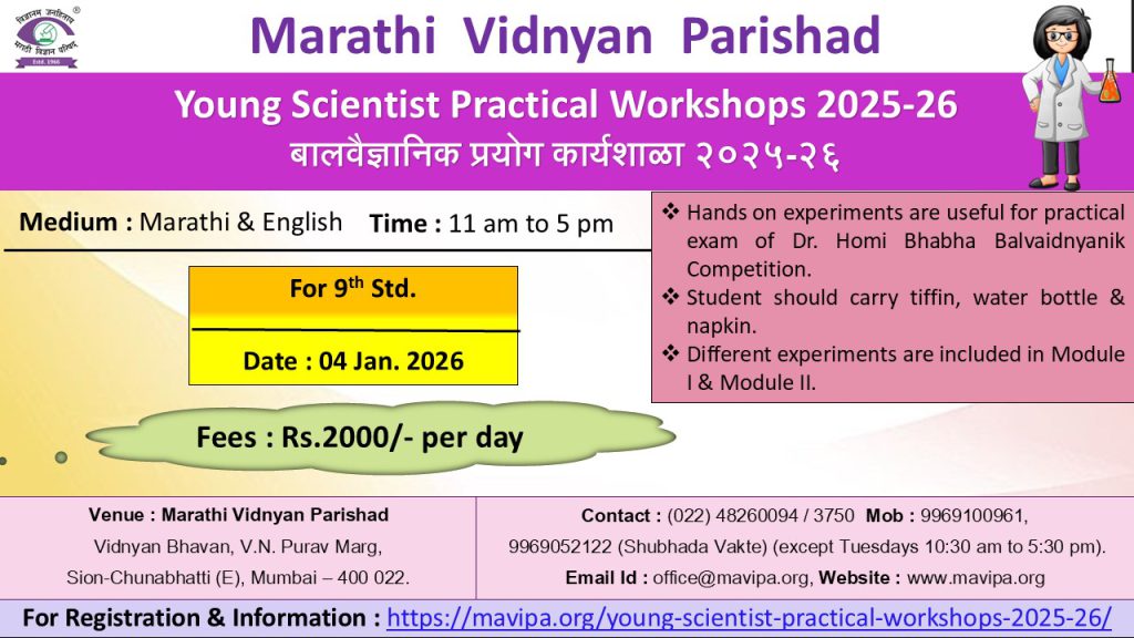स्थळ : मराठी विज्ञान परिषद, विज्ञान भवन, वि.ना. पुरव मार्ग, शीव-चुनाभट्टी (पू), मुबंई ४०००२२.